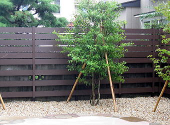 周囲の目隠しは樹脂製のフェンスと植栽で行って